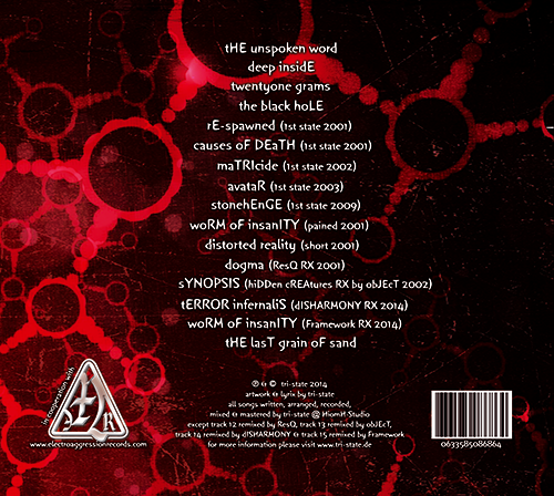 Tracklist thE unspoken word deep insidE twentyone grams the black hoLE rE-spawned (1st state 2001) causes oF DEaTH (1st state 2001) maTRIcide (1st state 2002) avataR (1st state 2003) stonehEnGE (1st state 2009) woRM oF insanITY (pained 2001) distorted reality (short 2001) dogma (ResQ RX 2001) syNOPSIS (hiDDen cREAtures RX by obJEcT 2002) tERROR infernaliS (dISHARMONY RX 2014) woRM oF insanITY (Framework RX 2014) tHE lasT grain oF sand