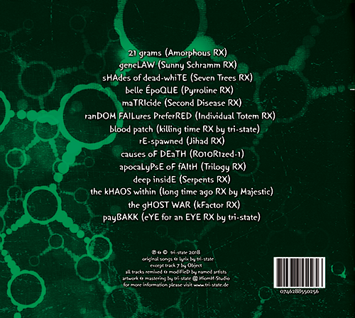 Tracklist 21 grams (Amorphous RX) geneLAW (Sunny Schramm RX) sHAdes of dead-whiTE (Seven Trees RX) belle ÉpoQUE (Pyrroline RX) maTRIcide (Second Disease RX) ranDOM FAILures PreferRED (Individual Totem RX) blood patch (killing time RX by tri-state, original by Object) rE-spawned (Jihad RX) causes oF DEaTH (R010R1zed-1) apocaLyPsE oF fAItH (Trilogy RX) deep insidE (Serpents RX) the kHAOS within (long time ago RX by Majestic) the gHOST WAR (kFactor RX) payBAKK (eYE for an EYE RX by tri-state)